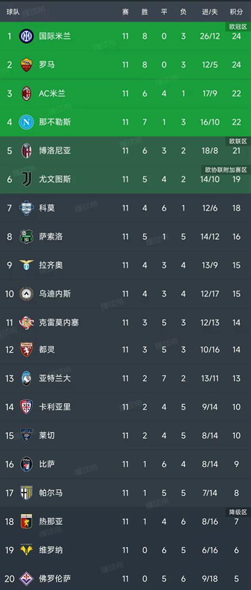 北京时间11月11日,意甲第11轮结束了所有比赛,最新积分榜如下!