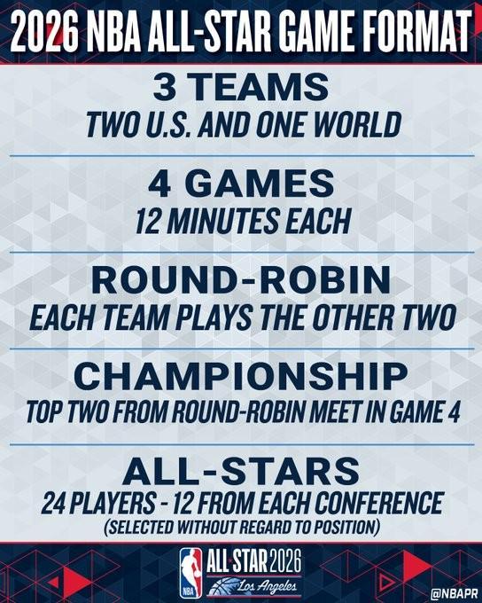 - NBA | NBA官方:2026年全明星赛将采用美国队对世界队的新赛制