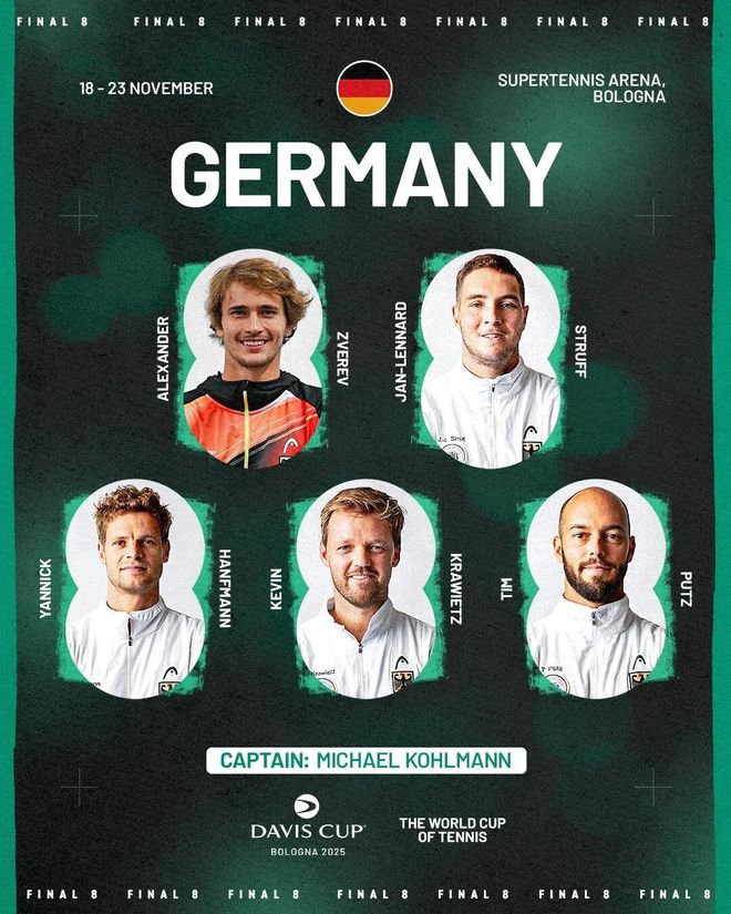 下半区方面,阿尔卡拉斯将领衔西班牙队,世界第一的阿卡因伤可能仅仅会出战单打,对阵一支拥有TOP20球星莱赫卡和门希克的捷克队。在最后一场四分之一决赛中,施特鲁夫和汉夫曼将携手兹维列夫为德国队出战,对阵阿根廷队的F.塞伦多洛和埃切弗里。