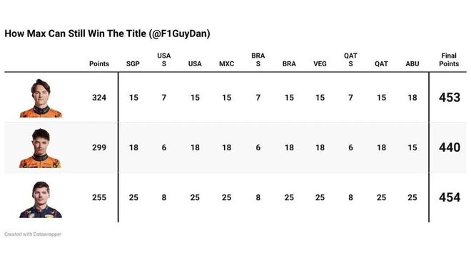 不过,即便接下去两场比赛维斯塔潘都拿到冠军,诺里斯只要是第二完赛,他依旧会是那个WDC,但谁知道呢?皮亚斯特里难道没有想法吗?这个赛季已经足够跌宕起伏,接下去就让我们屏息以待本赛季的大结局。