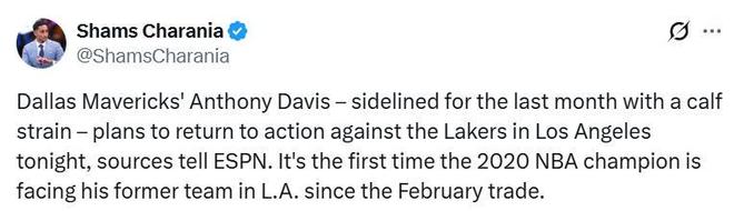 自今年2月那笔重磅交易以来,这将是浓眉首次在洛杉矶对阵自己的老东家湖人队。浓眉曾于上赛季在达拉斯与湖人有过一次交锋,那场比赛,独行侠主场97-112不敌湖人,浓眉出战33分22秒,13中5,得到13分11篮板6助攻。浓眉自10月30日起便一直缺阵,最初他将复出日期定在11月9日客场对阵华盛顿奇才队的比赛。然而,独行侠队老板杜蒙特搁置了这一计划——他听从了达拉斯队健康与表现主管比尔兹伯勒的建议,坚持认为除非有医疗数据表明浓眉不存在小腿拉伤加重的风险,否则不会批准其参赛。在周四的训练结束后,浓眉向记者表示,他将在独行侠队周末背靠背对阵两支洛杉矶球队(湖人与快船)的其中一场比赛中登场。“你知道我想打哪场比赛,”他说道,言语中暗指与老东家(湖人)的这场对决,“但具体情况还要看后续安排。”目前的计划是,浓眉将缺席明日对阵快船队的比赛,同时会出战周二客场对阵掘金队的比赛。浓眉此次复出,距离独行侠队解雇总经理哈里森已有17天;与此同时,外界普遍预计独行侠队将在2月初的交易截止日之前,为浓眉探索交易市场。“这(交易传闻)不会影响我,我已经被卷入交易讨论有一段时间了,”浓眉表示,“我的职责就是在球场上做好自己该做的事——打好篮球,并努力带领这支球队。无论最终结果如何,都顺其自然。对于这些事情,我其实并没有太多控制权,但我与球队管理层保持着畅通的沟通渠道,现在我只准备好重返赛场了。”美记Brett Siegel撰文谈到了浓眉的交易流言。他表示,关于浓眉可能转会的消息尚未有任何进展。NBA各队普遍认为,他很难恢复到在湖人时期的状态,他在独行侠的最新伤情也引起了外界的担忧。
