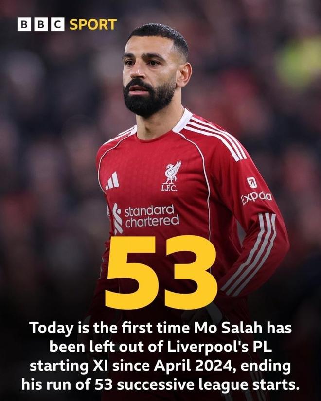遭遇三连败之后,斯洛特终于弃用了萨拉赫,这是斯洛特执教以来,萨拉赫首次没有在英超首发出场。这也是萨拉赫自2024年4月对西汉姆以来首次在英超担任替补,当时萨拉赫在替补出场时与克洛泽发生争执。回到替补席,让萨拉赫连续53场英超首发的纪录被终结。在被问及为何让萨拉赫担任替补时,斯洛特表示,“不是只有萨拉赫留在替补席,我们10天要踢4场,而且我有很多出色的球员,所以我做出了选择。有时候伊萨克会替补,有时候则是维尔茨,我理解大家会关注替补席。这不是我第一次让萨拉赫替补,就像我让维尔茨、伊萨克、埃基蒂克替补一样。”