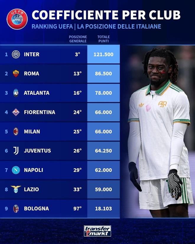 德转列意甲俱乐部近5个赛季欧战积分排名:1. 国际米兰 121.500分(全欧第3)2. 罗马 86.500分(全欧第13)3. 亚特兰大 78.000分(全欧第16)4. 佛罗伦萨 66.000分(全欧第24)5. AC米兰 66.000分(全欧第25)6. 尤文图斯 64.250分(全欧第26)7. 那不勒斯 62.000分(全欧第29)8. 拉齐奥 59.000分(全欧第33)9. 博洛尼亚 18.103分(全欧第97)