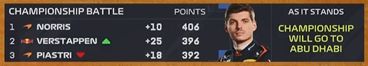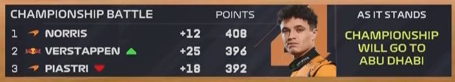 随后官方给出数据统计,如果比赛以这样的排位结束,那么皮亚斯特里将追近10个积分,维斯塔潘也将追回3分,三人将带着22分的积分差距进入阿布扎比大奖赛。