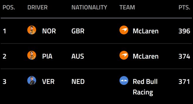 经历了冲刺赛后,前三名的积分差距发生了变化,诺里斯积396分排名第一,拿到冲刺赛冠军的皮亚斯特里积374分位列第二,排名第三的维斯塔潘积分为371分。