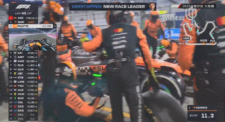与此同时,维斯塔潘已经追到了诺里斯身后0.5秒!圈速不断掉落的诺里斯若不进站,有被维斯塔潘超越的风险。
