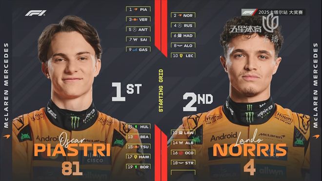 在昨天结束的排位赛中,皮亚斯特里夺得杆位,诺里斯在他身旁起步。维斯塔潘第三,和拉塞尔同处第二排发车!本站比赛,轮胎供应商的“强制两停”也为本场比赛增加变数。
