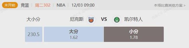 作为东部的传统豪强,凯尔特人本赛季由于核心塔图姆的受伤,不得不进行重建的道路,不过,球队近期状态回暖,12 月 1 日客场以 117 - 115 险胜骑士。此役中普理查德迎来生涯巅峰,狂砍 42 分,核心杰伦・布朗还贡献了 19 分 12 篮板 11 助攻的三双数据。目前球队战绩 11 胜 9 负位居东部第 8,但是,凯尔特人在阵容方面有伤病变数,除了核心塔图姆之外,近期状态不俗的核心后卫怀特由于小腿受伤,目前出战成疑,而状态不俗的中锋奎塔,也由于脚踝伤势存在不小的变数,这使得绿军目前的阵容存在着隐患。本场比赛,凯尔特人的对手,是本赛季发挥出色的尼克斯,尼克斯上一场比赛以22分大胜猛龙,近期取得了四连胜的佳绩,此番对阵绿军,从战绩上看,尼克斯要更好一些,不过凯尔特人毕竟坐拥主场优势,且球队近期四战三胜,状态也很不错,结合阿奴诺比和沙梅特目前无法上场的情况,胜负变得难以判断,但在比分方面,绿军多名主要得分手有伤在身,这使得他们的进攻火力有所下滑,而尼克斯一方,球队近期打出了非常不俗的防守表现,成功限制了猛龙的进攻,结合两队近期交锋,比分都偏低的情况,小比分,或许是本场的最优解。本场方案:小比分