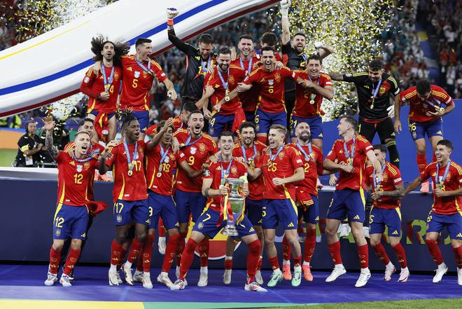 2024年7月14日,欧洲杯决赛,西班牙凭借奥亚萨瓦尔的进球2-1绝杀英格兰,以7战全胜的战绩,第四次赢得欧洲杯冠军。队长莫拉塔高举德劳内杯,德拉富恩特带队梦回博斯克时代。铁窗泪