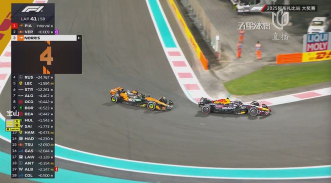 与此同时,第41圈,追到皮亚斯特里身后的维斯塔潘完成超越,前者也没有防守。被超后,皮亚斯特里立刻进站,出站后压在诺里斯身前约4秒左右。