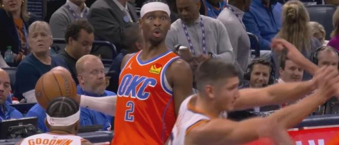 没有悬念的比赛,让我印象最深刻的回合是一个冲突。第三节,输急眼的知名“恶汉”格雷森-阿伦,掩护时直接抬肘放倒了切特,切特起来打算理论,杰威上去准备出头,两边队友纠缠到一起。最终裁判观看录像,二级恶意直接驱逐了阿伦。SGA的表情,亮了。