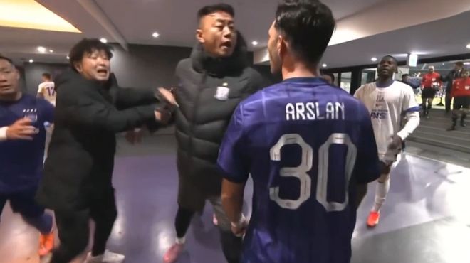 球场不是对手,场下反而我们不怵他们。这场比赛的中场休息时间,在球员通道里双方队员突然发生了一次冲突。原来当双方球员走回更衣室的时候,对方外援阿尔斯兰走着走着,猛然回头往回找。当他看到高天意的时候,一把揪住后者的胳膊说着什么。高天意没有说话,就这样互相纠缠着(上图)。就在这个时候,马纳法从身后及时出现,使劲把两人分开。很快走在高天意前面的申花门将教练李帅也意识到了什么,路见不平的他转头用手把阿尔斯兰推开。