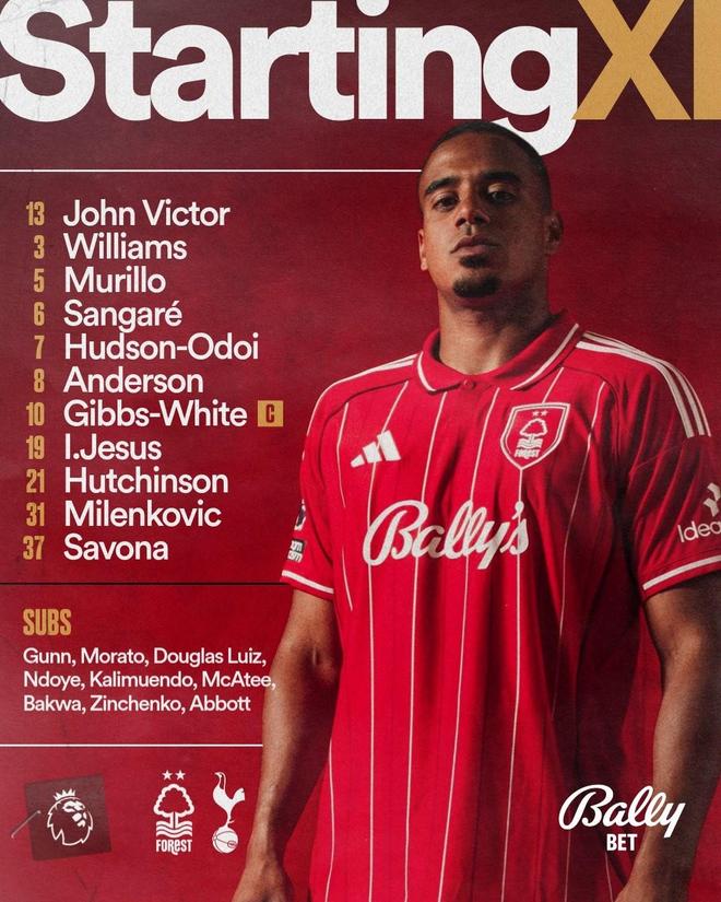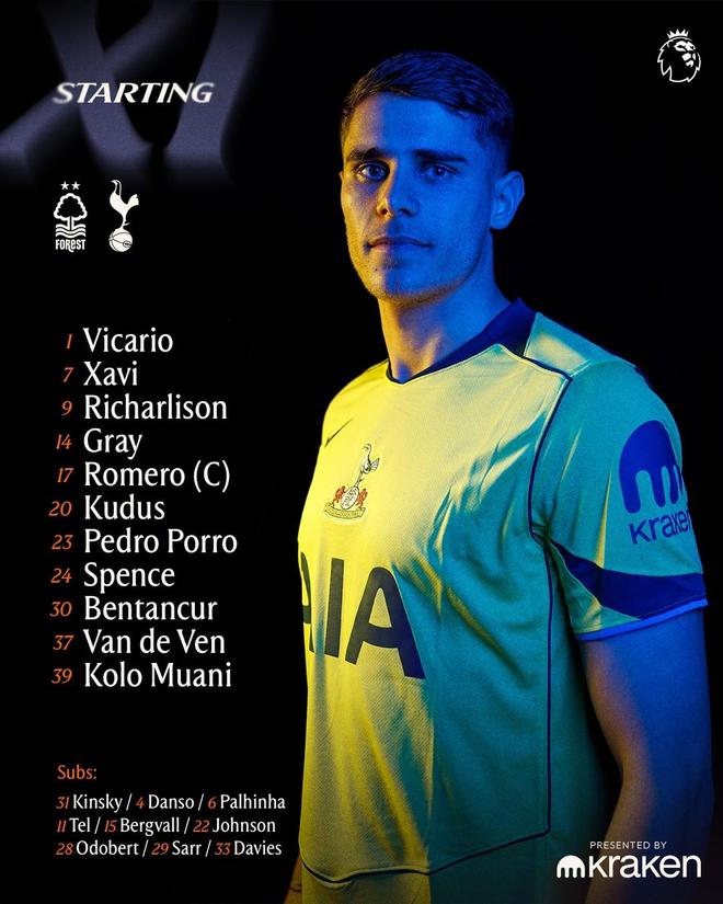 热刺首发:1-维卡里奥、17-罗梅罗、37-范德芬、23-波罗、24-斯彭斯、30-本坦库尔、14-阿奇-格雷、7-西蒙斯、39-穆阿尼、20-库杜斯、9-里沙利松替补:31-金斯基、4-丹索、6-帕利尼亚、11-特尔、15-贝里瓦尔、22-布伦南-约翰逊、28-奥多贝尔、29-萨尔、33-本-戴维斯诺丁汉森林首发:13-约翰-维克托、3-内科-威廉斯、5-穆里略、31-米伦科维奇、37-萨沃纳、6-桑加雷、8-埃利奥特-安德森、21-哈钦森、10-吉布斯-怀特、7-奥多伊、19-伊戈尔-热苏斯替补:18-冈恩、4-莫拉托、35-津琴科、44-阿博特、12-道格拉斯-路易斯、24-麦卡蒂、14-恩多耶、15-卡利穆恩多、29-巴夸