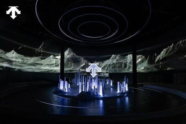 随着光影点亮象征未来的时空之门,"未来使者"身着未来感装备自高空滑入秀场,将"未来之城"转化为立体的冰雪场域。随着他的落点,环幕之上山峰与雪线被逐一唤醒,仿佛一座真实雪场被带入现场。这一幕呼应着迪桑特"一切始于滑雪"的品牌基因——滑雪运动的专业内核早已深植品牌之中,而这场空中演绎,正是对这份初心的当代诠释,更以动感姿态串联起冰雪文化、科技表达与品牌精神,构建起品牌从专业根基迈向未来运动文明的完整视觉语言。