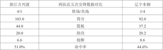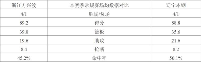 主要球员上赛季常规赛数据:浙江方兴渡:胡金秋:本赛季常规赛出战5场,场均上场28.4分钟,得到20.6分、6.0个篮板。布朗:本赛季常规赛出战5场,场均上场24.6分钟,得到20.6分、2.6个篮板、2.0次助攻、1.8次抢断。塔克:本赛季常规赛出战5场,场均上场13.2分钟,得到11.8分、1.0个篮板、1.2次助攻。辽宁本钢:威尔斯:本赛季常规赛出战5场,场均上场31.2分钟,得到23.0分、5.0个篮板、5.8次助攻。付豪:本赛季常规赛出战5场,场均上场26.8分钟,得到13.4分、5.8个篮板、1.0次助攻。王岚嵚:本赛季常规赛出战5场,场均上场26.6分钟,得到11.0分、1.2个篮板、3.6次助攻、1.4次抢断。里程碑数据:浙江方兴渡:孙铭徽CBA生涯助攻总计为2633次,位列CBA历史助攻榜第4位,距离第3位的郭艾伦(2649次)还差16次。胡金秋CBA生涯篮板总计为4119个,位列CBA历史篮板榜第8位,距离第7位的哈马德·哈达迪(4601个)还差482个。胡金秋CBA生涯总得分为8989分,位列CBA历史得分榜第9位,距离第8位的唐正东(9087分)还差98分。孙铭徽CBA生涯抢断总计为797次,位列CBA历史抢断榜第13位,距离第12位的西热力江·木合塔尔(802次)还差5次。胡金秋CBA生涯盖帽总计为425次,位列CBA历史盖帽榜第22位,距离第21位的闫鹏飞(427次)还差2次。赵岩昊CBA生涯三分命中总计为713个,位列CBA历史三分榜第39位,距离第38位的遇俊锴(720个)还差7个。赵岩昊CBA生涯抢断总计为573次,位列CBA历史抢断榜第41位,距离第40位的林志杰(576次)还差3次。辽宁本钢:李晓旭CBA生涯篮板总计为5428个,位列CBA历史篮板榜第3位,距离第2位的韩德君(5703个)还差275个。李晓旭CBA生涯盖帽总计为458次,位列CBA历史盖帽榜第14位,距离第13位的易立(494次)还差36次。埃里克·莫兰德CBA生涯盖帽总计为380次,位列CBA历史盖帽榜第25位,距离第24位的萨马基(393次)还差13次。李晓旭CBA生涯抢断总计为639次,位列CBA历史抢断榜第29位,距离第28位的凯尔·弗格(642次)还差3次。付豪CBA生涯篮板总计为2585个,位列CBA历史篮板榜第37位,距离第36位的任骏威(2622个)还差37个。李晓旭CBA生涯总得分为6486分,位列CBA历史得分榜第38位,距离第37位的孟达(6527分)还差41分。埃里克·莫兰德CBA生涯篮板总计为2368个,位列CBA历史篮板榜第46位,距离第45位的皮特·拉莫斯(2410个)还差42个。