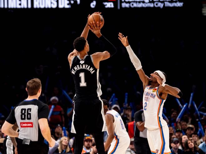 当然,我们知道如果单纯用罚球数对比难免有失偏颇,但如果罚球数少的同时,充斥着大量关键时刻的罚球福利,那意味着更是司马昭之心路人皆知。雷霆通过战绩把自己包装成联盟最强,甚至NBA历史上净效率值最高的球队,这一泡沫被戳破的过程,马刺将联盟的遮羞布撕下来。马刺是典型的放投不放突,能击败马刺的球队存在,比如勇士。因为11月份库里一场轰46分,一场轰49分,用三分球打穿了马刺的防线。可是雷霆不行啊,雷霆一没有稳定投射空间点,二是依靠一些关键吹罚获利,三是没人对得上文班亚马。