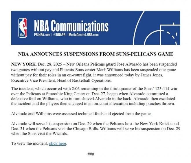 - NBA | NBA官宣太阳鹈鹕冲突罚单:阿尔瓦拉多禁赛2场马威禁赛1场