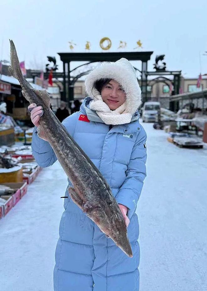 黄菲在抚远东极见识到了当地的特产鲟鳇鱼