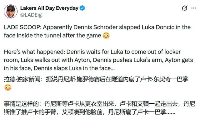 湖人自媒体LADE爆料,施罗德赛后在更衣室门口等东契奇,推搡过程中甚至扇了东契奇一巴掌,艾顿则是上前挡在二人中间。