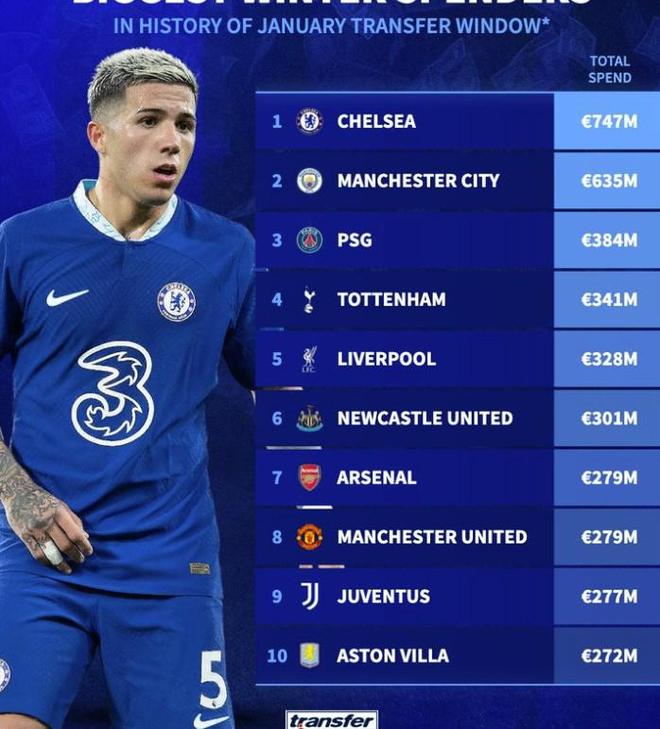 - 英超 | 冬窗历史转会支出榜:切尔西7.47亿欧居首,前十英超占8席
