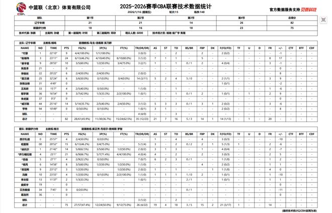 2025-2026赛季CBA常规赛第十五轮,辽宁本钢对阵新疆伊力特的比赛于16日晚在辽宁体育馆进行,辽宁本钢队最终82:75击败新疆伊力特。
