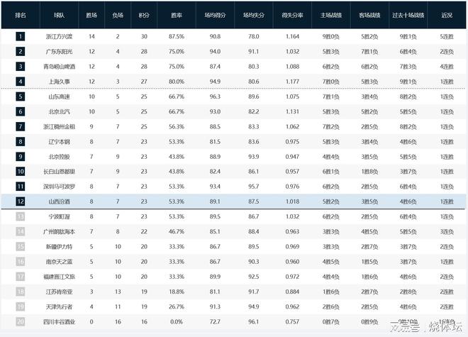 至此,青岛男篮斩获4连胜,总成绩提升为12胜4负积28分,排名暂时升至第三。浙江稠州男篮的5连胜被终结,总成绩改写为9胜7负积25分,综合战绩还不错。