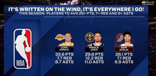 需要关注的是,东契奇在此役还创下了纪录。转播方数据显示,本季联盟仅3人场均超25分7板6助:东契奇、约基奇、阿夫迪亚。