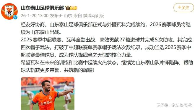 - 中超 | 山东泰山官宣跟瓦科正式续约,继续为俱乐部出战中超,值得期待