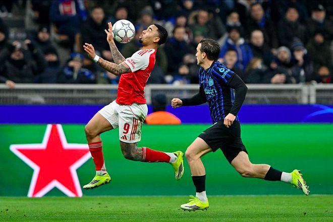 第10分钟,阿森纳前场连续一脚传球令国米的防线顾此失彼,廷贝尔将球扫到中路,热苏斯插上,打破僵局。